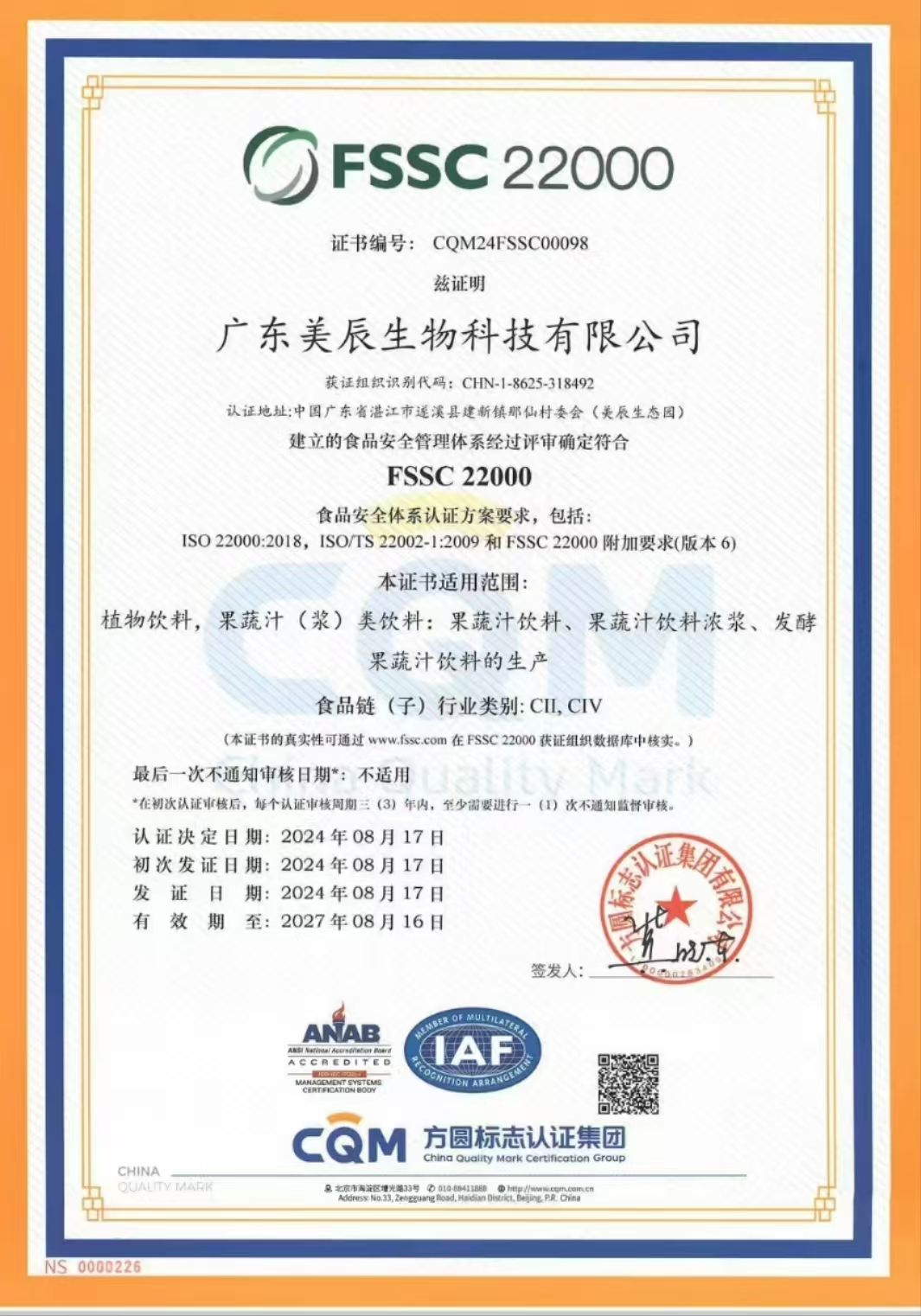 今天我們非常高興地宣布,廣東美辰已經(jīng)成功取得FSSC22000認(rèn)證!這是我們公司長期以來的努力和堅(jiān)持的結(jié)果,也是對我們公司質(zhì)量管理體系的高度認(rèn)可。
